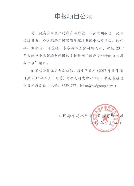 關(guān)于申報2017年大連市重點領(lǐng)域創(chuàng)新團隊支持計劃“海產(chǎn)安全檢測公共服務(wù)平臺”項目的公示